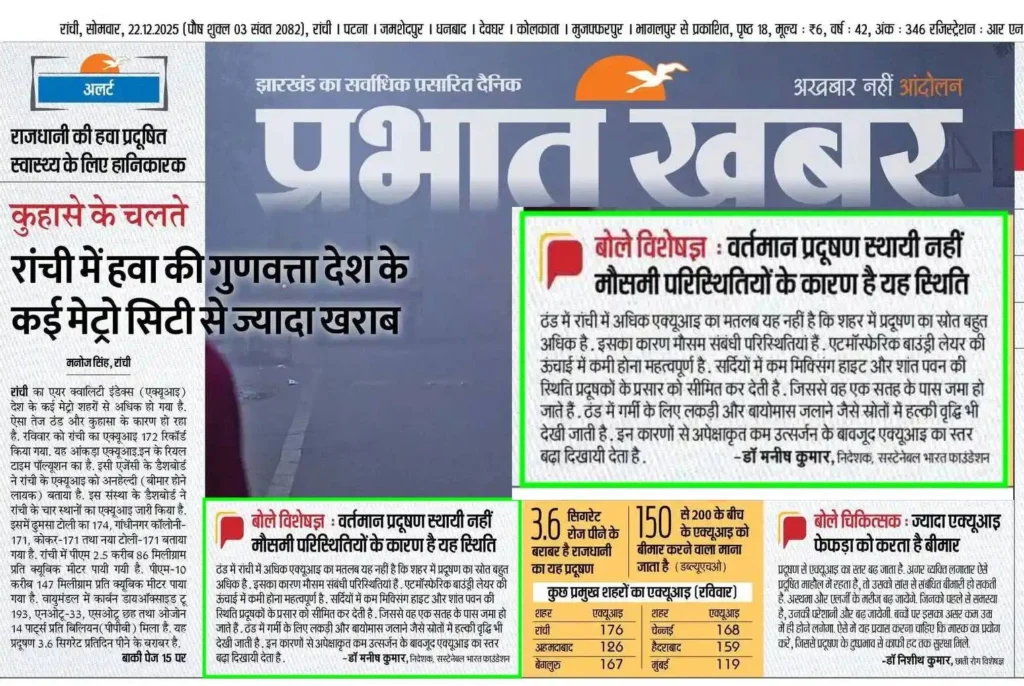In this context, Prabhat Khabar, a leading Hindi daily, recently cited Dr. Manish Kumar, Executive Director of our organization, in its coverage of prevailing air quality conditions in Ranchi. Dr. Kumar offered a scientific perspective on the winter-time AQI trends, noting that short-term increases in AQI should not be interpreted solely as a reflection of high pollution emissions.