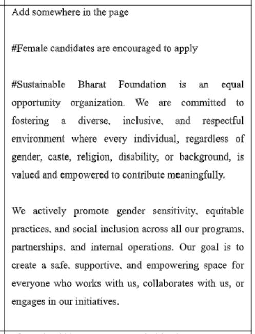 Sustainable Bharat Foundation is an equal opportunity organization. We are committed to fostering a diverse, inclusive, and respectful environment where every individual, regardless of gender, caste, religion, disability, or background, is valued and empowered to contribute meaningfully.